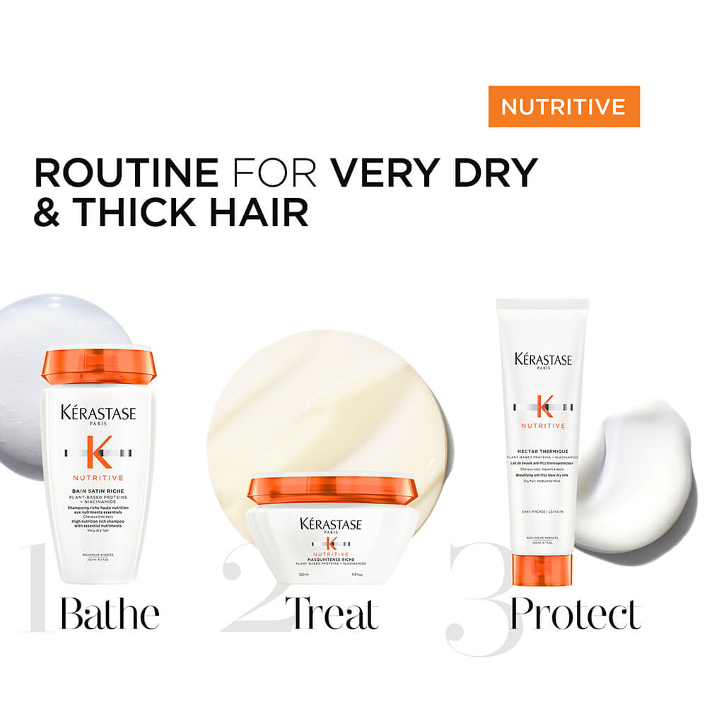 مجموعة كيراستاس نوتريتيف غنية بالمغذيات الأساسية التي يحتاج إليها شعركِ للحفاظ على صحته وقوته وسهولة تصفيفه لحين موعد زيارتك التالية إلى الصالون.