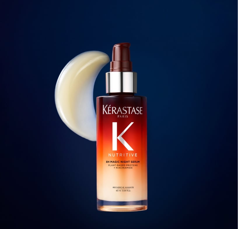 8H Magic Night Serum by Kérastase is a beauty sleep high nutrition serum for dry hair. This overnight hair treatment contains anti-dryness polymers for immediate care with a light and non-greasy finish. It also delivers a dose of essential nutrients that boost the formula’s ability to nourish and reinforce the hair.